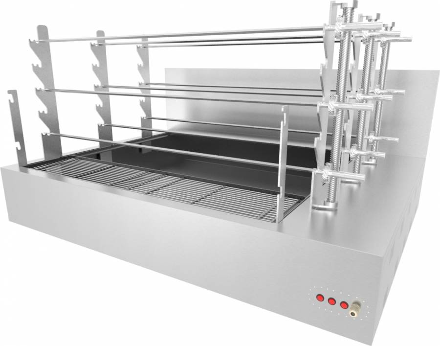 Κατασκευή από ανοξείδωτο χάλυβα AISI 430 σατινέ με φινίρισμα scotch brite – Κάθε άξονας διαθέτει ξεχωριστό μοτέρ βαρέως τύπου, με ανεξάρτητο διακόπτη λειτουργίας – Άξονας υπό κλίση με λάμες 5 θέσεων - Περιλαμβάνει : 2 σχάρες επινικελωμένες, 3 άξονες, 9 σούβλες και 6 άγκιστρα.